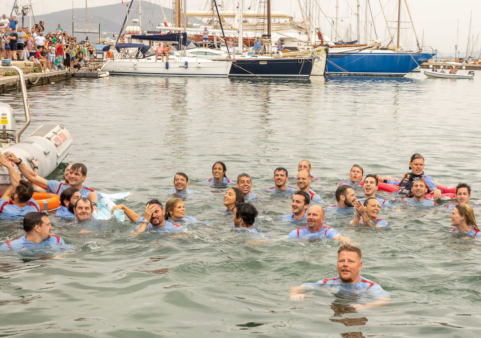 Long lasting tradition for winning team in Sardinia - many team members, including winning crew, jump into harbor water to cool off. This is Hyundai after Ott Tanak's 2022 win.